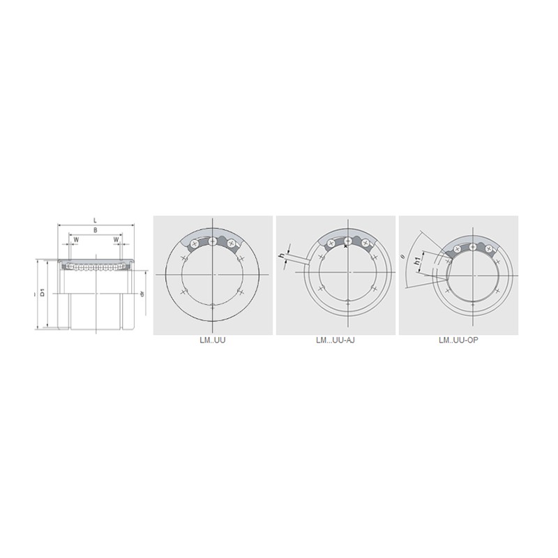 | LM… uu | Mạch bóng | Trọng lượng (kg) | LM… uu-aj | Mạch bóng | Cân nặng | LM… uu-op | Mạch bóng | Trọng lượng (kg) | mm | mm | Sức chịu đựng | Sức chịu đựng | D mm | Dung sai (μM) | L mm | Dung sai (μM) | B mm | Dung sai (μM) | W (mm) | D1 (mm) | H (mm) | H1 (mm) | θ | Độ chính xác | Cao | Năng động | Tĩnh | |